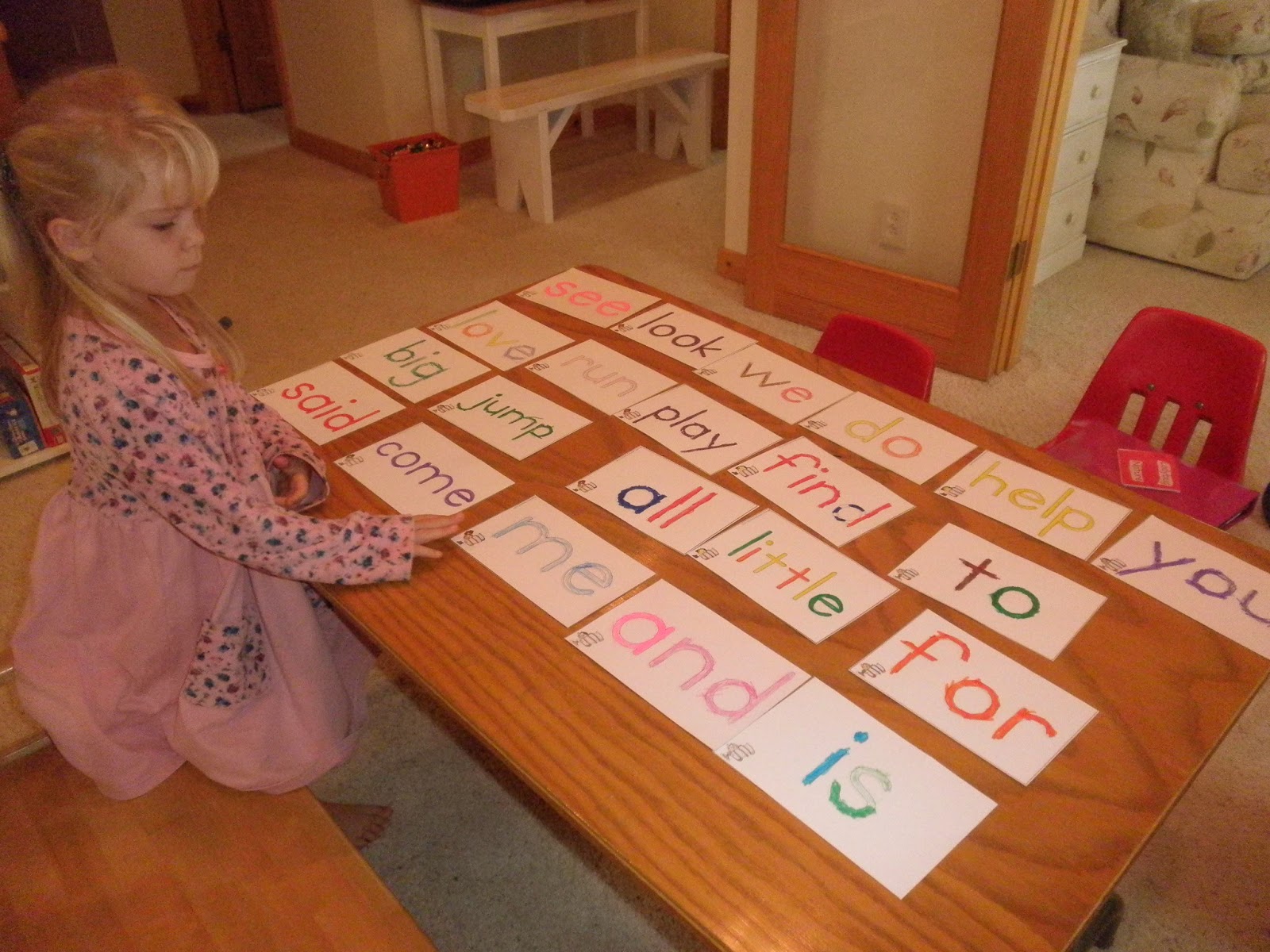 K is matching solid pictures and word cards. I read the word cards and she did the matching.